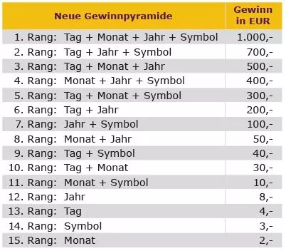Die Gewinnpyramide wird gemäß den neuen Spielbedingungen adaptiert. Einen Überblick dazu findest du in der nachstehenden Tabelle: