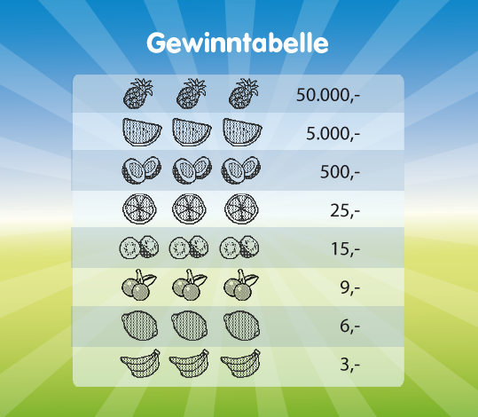Rubbel „Spiel 1“, „Spiel 2“, „Spiel 3“ und „Spiel 4“ auf. Pro Spiel (= eine waagrechte Reihe) findest du 3 Symbole. Bei 3 gleichen Symbolen in einer waagrechten Reihe gewinnst du den in der Gewinntabelle vorgesehenen Betrag 1-mal.