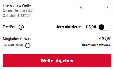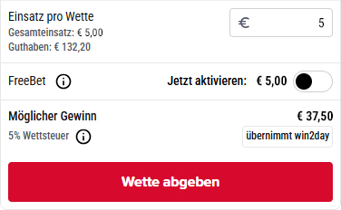 Mit jeder Wettabgabe auf win2day Sports um mindestens € 1 (Cash) haben die Teilnehmer: innen die Chance eine FreeBet für Sportwetten im Wert von € 1 zu gewinnen. Jeder win2dayweit abgegebene 10. Wettschein (nicht jeder 10. Wettschein pro Teilnehmer:in) gewinnt eine € 1 FreeBet. Pro Aktionstag und Teilnehmer: in können max. 5 FreeBets gewonnen werden. Die Höhe des Wetteinsatzes beeinflusst die Gewinnwahrscheinlichkeit nicht Der Mindesteinsatz beträgt € 1.
