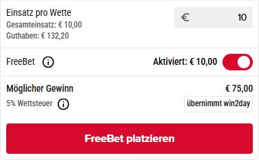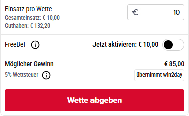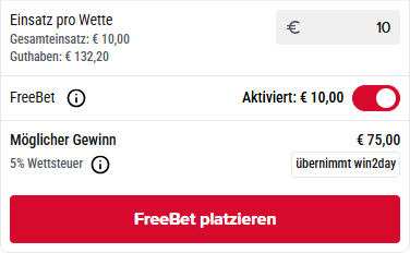 Mit deiner Live-Wette in Höhe von mindestens € 10 konntest du dir eine FreeBet im Wert von € 10 sichern. Diese kannst du bis zum 30.09.2027 einlösen, indem du sie in deinem Wettschein aktivierst und bestätigst.